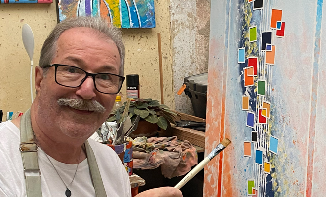 Produz trabalhos figurativos e abstratos, onde as cores dominam o visual.
